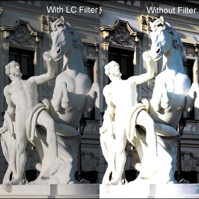 The low contrast filter reduces the difference between the light and dark areas of the scene, preventing highlights from blowing out while still maintaining detail in the shadow areas. The low contrast filter works by spreading some of the light from the bright areas onto the other parts of the image. It is ideal for use in sunlight or when other very bright lights are being used. It is often used in video work as a way to compensate for the video CCD's lack of latitude (compared to that of film stock).